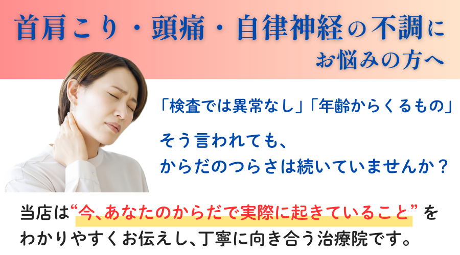 首や肩のつらさ、頭痛や自律神経の乱れは、「忙しいから…」「そのうち良くなるかも」と後回しにしがちです。でも、本当にしんどいときほど、ひとりで頑張らなくて大丈夫。当店では、初めての方にも安心していただけるように、丁寧なヒアリングと、おからだに合わせた施術を行っています。
